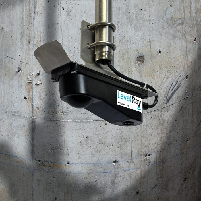 Teledyne ISCO Water’s LevelRay non-contact level sensor uses FMCW (Frequency Modulated Continuous Wave) technology to remotely measure liquid level. The sensor is mounted over the flow stream, transmitting and receiving radar waves that are reflected off the liquid’s surface. The elapsed time between transmitted and returned signals determines liquid level. The non-contact measurement method reduces the frequency of maintenance and is ideal for applications where the flow may contain chemicals, grease, silt, or suspended solids.